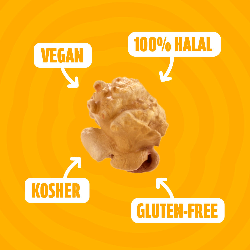 Popped from premium mushroom kernels, every piece pops with attitude; bred to explode firm, round, and dense like butterscotch-clinging show-offs that lock in every golden bite. Each bag clocks in at just 120 kcal, so you get all the flavour without the faff. We’ve kept it clean with our vegan, gluten-free, and kosher-certified recipe that skips the dairy but keeps the indulgence.