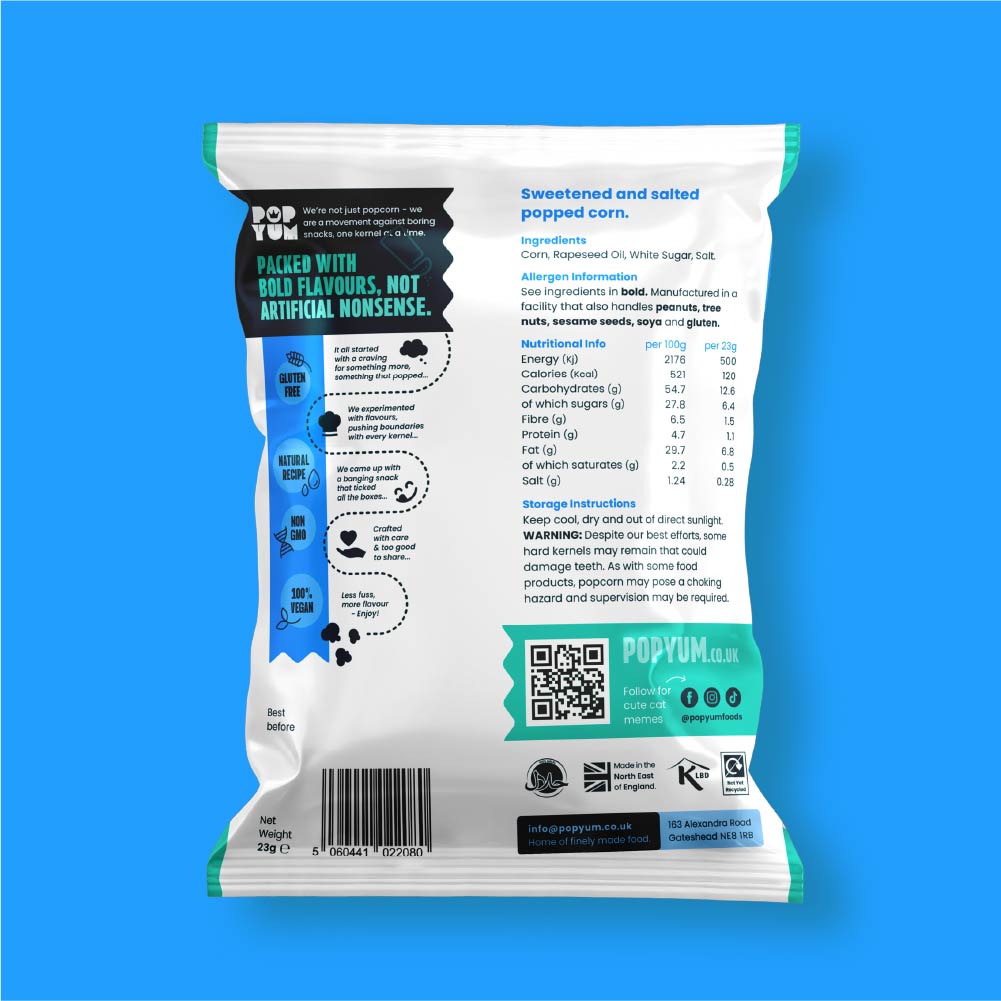 Our Sweet & Salty Popcorn delivers that classic combo with a Pop Yum twist. Bold, balanced, and impossible to ignore. It’s your go-to snack when you want flavour that flips from smooth to savoury in every bite.